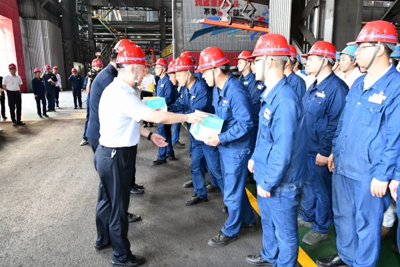 在龍鋼公司煉鋼新區(qū)連鑄高溫生產(chǎn)現(xiàn)場,領(lǐng)導(dǎo)們與職工們一一握手,并將防暑降溫飲品遞到他們手中,叮囑職工們做好暑期防護(hù)。