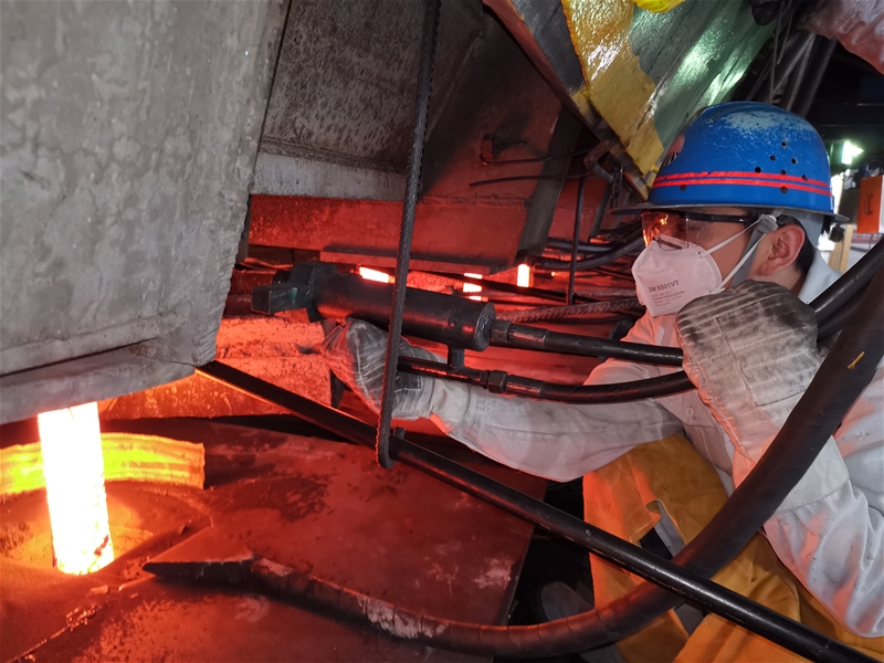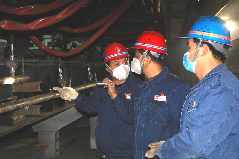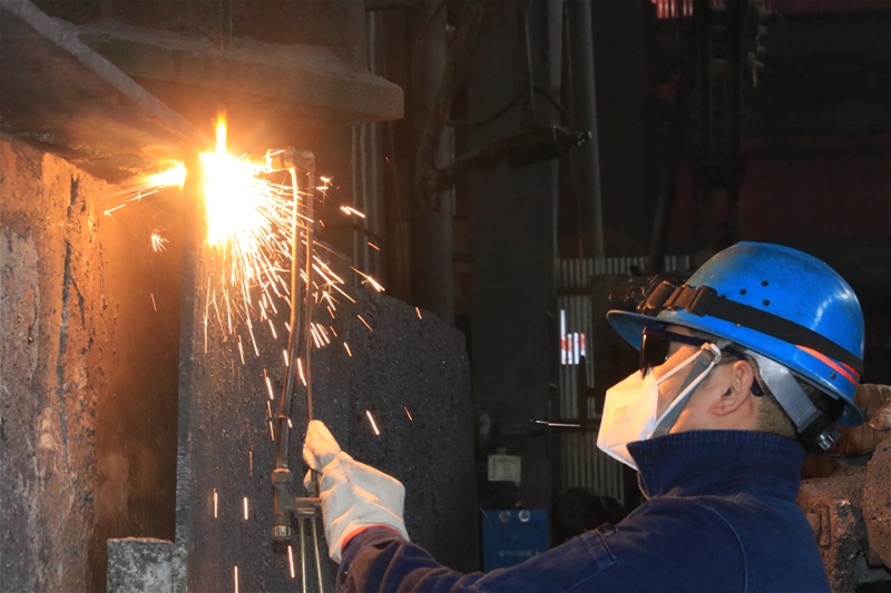 臺(tái)下推鋼機(jī)處,陣陣焊花燦爛奪目,仔細(xì)一看,原來是支援的維修工們正在對(duì)推鋼機(jī)大梁進(jìn)行校正,幾名維修工人手一把焊槍、一個(gè)面罩,忙得不亦樂乎,雖然氣溫已到零下,但他們黝黑的臉龐爬滿了汗珠。