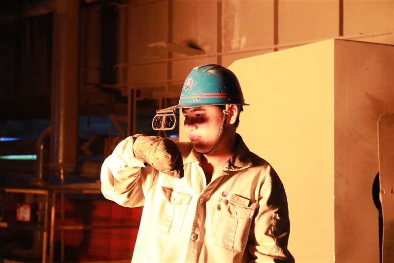 8點(diǎn)30分,6#轉(zhuǎn)爐操作室內(nèi),姚永青正全神貫注地扳動操縱桿,室外的轉(zhuǎn)爐緩緩轉(zhuǎn)動。頓時(shí),一股灼人的熱浪逼來,轉(zhuǎn)爐張開“火”盆大口,內(nèi)壁像巖漿表面隨時(shí)能噴出火來。刺眼的紅光逼得人睜不開眼睛,姚永青卻專注地盯著火紅的爐膛,認(rèn)真地觀察爐況。一眨眼的功夫,姚永青已經(jīng)沖到了爐前。再回來時(shí),他的汗正順著頭發(fā)往下滴,衣服已經(jīng)被汗水浸透。據(jù)了解,這樣的工作,他每天要重復(fù)十幾次。