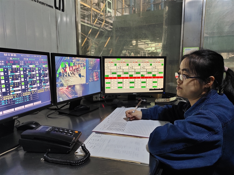主控工陳小育一只手拿著訊響器播報(bào)中包溫度,另一只手正在認(rèn)真書(shū)寫(xiě)中包溫度。五分鐘一次的播報(bào)溫度,十分鐘一次的記錄書(shū)寫(xiě),她就這樣一直忙碌著。推鋼工吉銳琴站在操作臺(tái)前,一會(huì)兒抬頭看看顯示器,一會(huì)兒看看臺(tái)下運(yùn)行的鑄坯,手指在按鈕上不停地“舞蹈”??雌饋?lái),似乎主控工和推鋼工的工作都很輕松、簡(jiǎn)單。實(shí)則不然,這完全考驗(yàn)她們的反應(yīng)速度、眼力、手力、心理承受能力等。她們堅(jiān)持將簡(jiǎn)單的事情重復(fù)做,重復(fù)的事情用心做,無(wú)怨無(wú)悔,用瘦弱的身體挑起了生產(chǎn)的重?fù)?dān),用實(shí)際行動(dòng)詮釋著巾幗擔(dān)當(dāng)。