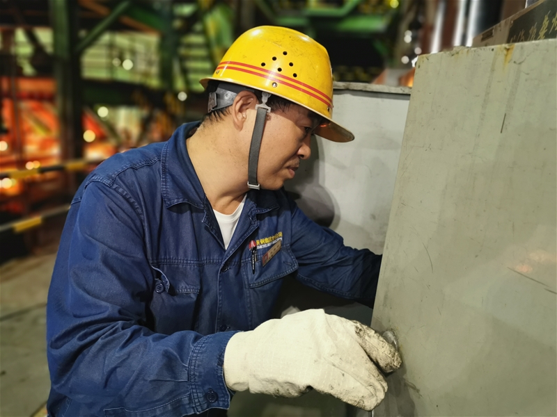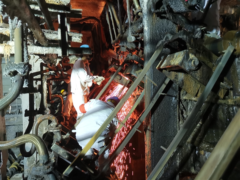 剛剛停機(jī)的現(xiàn)場,被熱浪團(tuán)團(tuán)包裹,像極了一個巨型蒸籠。檢修時間只有兩小時,這對他們來說,無疑是一個挑戰(zhàn),大家等不及設(shè)備溫度降下來,就迫不及待地來到各自負(fù)責(zé)區(qū)域,一瞬間,澆鋼區(qū)、二冷室、拉矯機(jī)、輥道旁……人頭攢動、熱鬧非凡。二冷室內(nèi)潮濕悶熱,作業(yè)環(huán)境復(fù)雜,讓人呼吸都變得困難,幾名身穿白色阻燃服的中包工,順著噴淋管爬上爬下,他們腳踩在細(xì)細(xì)的支架上。這群“蜘蛛俠”在縱橫交錯的管道間,隨意調(diào)整著身體,有的仔細(xì)清理噴咀,有的認(rèn)真切割冷鋼,這看起來困難重重的工作,他們卻游刃有余。不一會,他們厚厚的工作服被汗水浸濕,臉上的汗水也在大負(fù)荷照明燈下泛著亮光。可盡管如此,他們的目光始終盯在設(shè)備上,沒有半分懈怠。