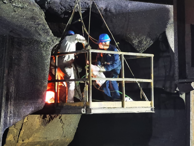 雖然已經(jīng)停爐許久,但爐內(nèi)溫度仍然是居高不下,仿佛一個(gè)蒸籠一樣,厚厚的阻燃服和面部護(hù)具讓人在里邊喘氣都困難,但所有參與砌爐的隊(duì)員們堅(jiān)持著、沖刺著……為了多出一份力,雖然規(guī)定30分鐘必須出來(lái),但有的檢修隊(duì)員卻一干就是一個(gè)小時(shí),甚至更多。受散發(fā)熱浪混鐵爐影響,筆者在不遠(yuǎn)處無(wú)法看清他們的面容,但能真切感受到他們身上那股無(wú)形的力量不斷推動(dòng)著檢修向前進(jìn)行……爐內(nèi)的人細(xì)心地砌著,爐外的人手眼并用,及時(shí)跟著遞著,他們配合密切,砌筑的速度穩(wěn)而有序。此時(shí)此刻,高溫在肆虐,炙烤在持續(xù),員工的熱情和工作效率始終沒(méi)有“打折扣”。堅(jiān)持到底、舍我其誰(shuí),他們正與火熱高溫進(jìn)行著一番較量。