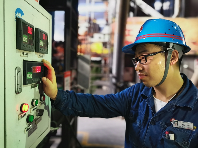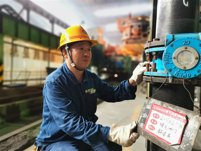 圖三:煉鋼廠連二作業(yè)區(qū)安全員張保銀正在檢查煤氣設(shè)備,現(xiàn)場的溫度持續(xù)攀升,汗珠順著他的臉頰滾落,但是他始終牢記自己的職責(zé)與使命,不放過任何一個細節(jié),用實 際行動踐行著自己的安全誓言。