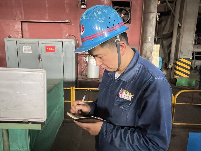 圖九:煉鋼廠天車作業(yè)區(qū)天車工李鋒博在記錄設(shè)備運行情況,他所在的出坯垮地面全是1000℃的紅坯,熱量持續(xù)往上方擴散,臉上的汗珠往下滑落,不變的是他對設(shè)備的認真負責(zé)。