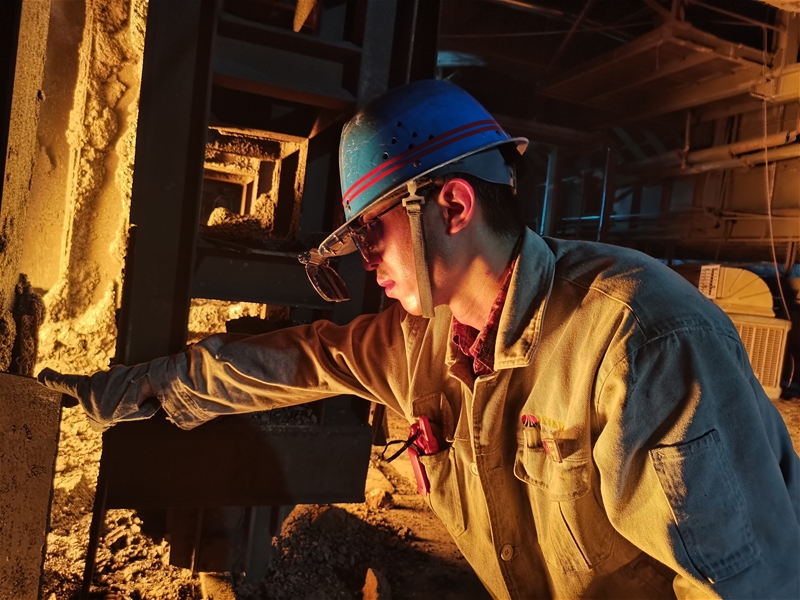 圖八:煉鋼廠連二作業(yè)區(qū)6#連鑄機中包工何武濤正在對在線水口、機件進行檢查。面對眼前1500℃的鋼水,他眼戴護目鏡,身穿阻燃服,在汗流浹背中守護著安全生產(chǎn)。