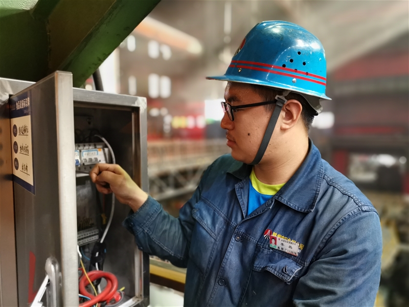 圖四:煉鋼廠轉(zhuǎn)爐平臺上電儀作業(yè)區(qū)電工李磊正在對配電柜線路進行檢查,滾滾熱浪撲面而來,他身上的汗腺像被擰開了的開關(guān),瞬間汗如泉涌。