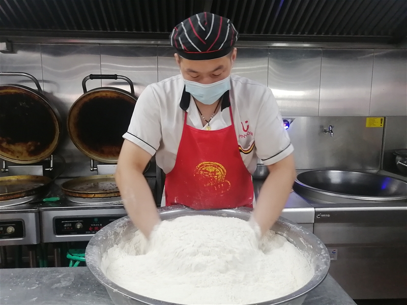 開始做午餐的各項準備工作:清洗、切配、砍骨頭、切肉、揉面等等,隨著爐灶排風(fēng)機的啟動,灶臺旁的廚師們開始了午餐的精心烹飪。