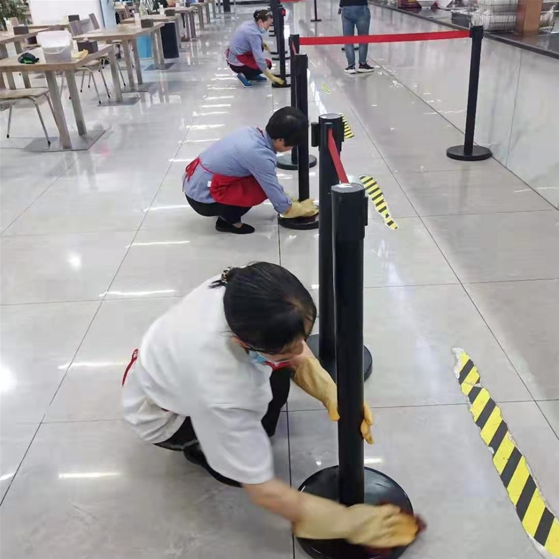 餐具回收處,職工用餐完后自覺送餐具,洗消人員緊張分類清洗,保潔人員也在緊張有序地清理桌面、補充紙巾。