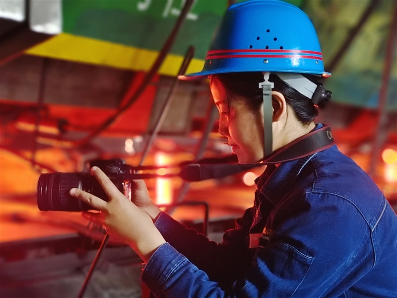 初見她時,她戴著藍色安全帽,手里舉著照相機,正在煉鋼廠6#連鑄機中包澆鋼區(qū)拍攝視頻。當時正值夏季,室外溫度30度,火辣辣的太陽炙烤著大地,仿佛要把所有東西都融化,廠房里的溫度更是高達四五十度,仿佛一個巨大的“蒸籠”。她半蹲在鋼流前,任憑身后鼓鼓的風機肆意地吹向她,藍色工作服在強力的風中緊緊地貼著她的身體,鬢角散落的發(fā)絲在風中隨意飄蕩,但她依然堅守在鋼流前,用手中的相機記錄現(xiàn)場設備改造這一場景,成為連鑄平臺上一道靚麗的風景線。