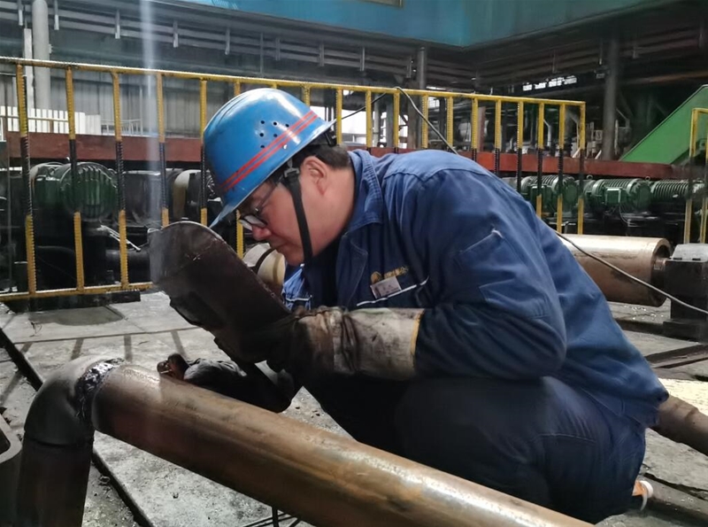走進軋鋼工序板帶作業(yè)區(qū)卷曲下料處檢修現(xiàn)場,鏗鏘敲擊聲、焊花四濺。鉗工馬龍頭戴安全帽,目光如炬,正在焊接下料平臺架子,周圍的冷空氣360度無死角彌漫,他全然不顧,忙得不亦樂乎。