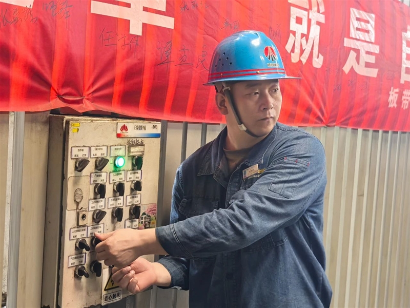 上午8:10,激烈而緊張的換輥“競賽”正式開始,只見“參賽者”的身影穿梭在現(xiàn)場,仿佛4×100游泳接力賽場上你追我趕的運動員。軋鋼工緊密協(xié)作,動作嫻熟,每一個步驟都精準無誤。王煜和范宇坤負責拆卸舊輥,并配合天車工將需要更換的軋輥慢慢從軋機中抽出來,放置在下線軋輥指定地點。李陽和楊延博配合默契,負責吊運新輥以及安裝調(diào)試工作,只見一人負責操作箱操作,一人根據(jù)其指示小心翼翼地操作按鈕,調(diào)試后再仔細檢查,確保導衛(wèi)和除塵水管完好無損。精軋班長蓋俊生則負責檢查換輥質(zhì)量,整個過程每一個人都恪盡職守、全力以赴,每一個環(huán)節(jié)都如同接力賽中的一棒,傳遞著責任與使命。