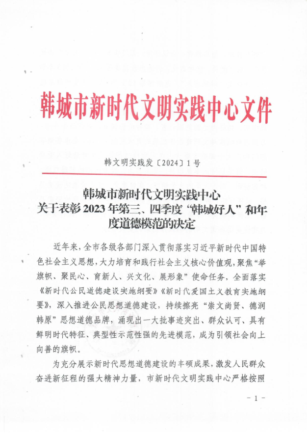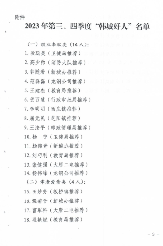 近日,韓城市2023年第三、四季度“韓城好人”和年度道德模范名單出爐。公司6名職工“榜上有名”。其中范磊磊、楊偉峰榮獲敬業(yè)奉獻類“韓城好人”,巨輝、路鵬榮獲見義勇為類“韓城好人”,周海霞榮獲助人為樂類“道德模范”,王亞軍榮獲自強勵志類“道德模范”。