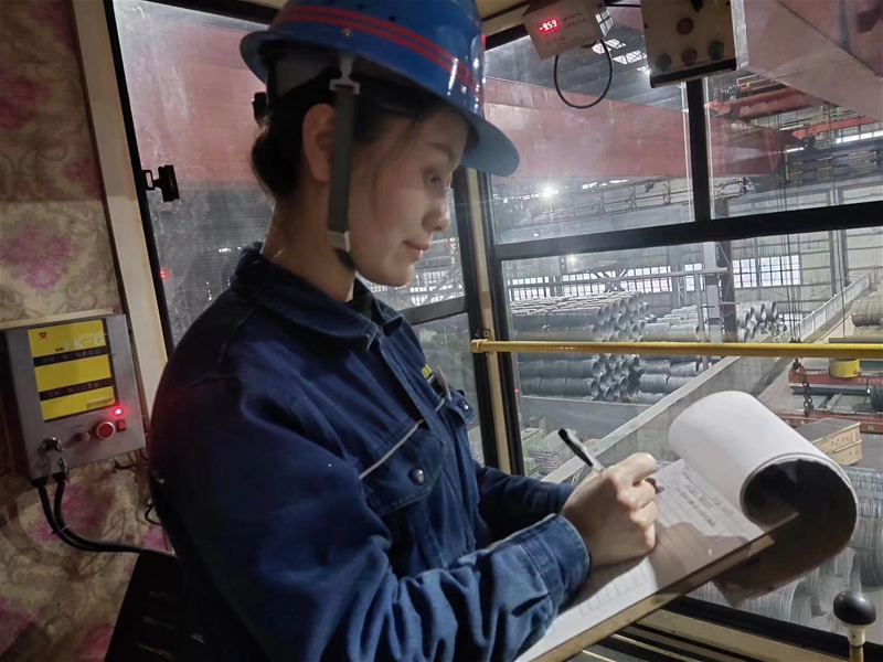 2019年9月,作為新入職大學(xué)生的她加入軋鋼廠(chǎng)天車(chē)工這個(gè)大家庭。身為學(xué)徒,在看到師傅第一時(shí)間處理軋線(xiàn)飛鋼的從容時(shí),她便在心里默默立下目標(biāo):“我要抓緊時(shí)間努力練習(xí),爭(zhēng)取早日出師,做獨(dú)當(dāng)一面的員工。”于是,在后來(lái)的學(xué)習(xí)中,她盡可能地抓住每一次可以練習(xí)穩(wěn)鉤、開(kāi)車(chē)的機(jī)會(huì),買(mǎi)飯的路上風(fēng)馳電掣,打掃衛(wèi)生馬不解鞍。為減少如廁次數(shù),她盡量少喝水,有時(shí)甚至幾個(gè)小時(shí)都不喝水。在崗的時(shí)間被她合理安排,下班之后她仍然堅(jiān)持學(xué)習(xí),穩(wěn)扎穩(wěn)打的基本功在她的爭(zhēng)分奪秒中迅速得到提升。帶著進(jìn)廠(chǎng)時(shí)的初心,她成為同一批學(xué)徒中最早出師的女天車(chē)工。