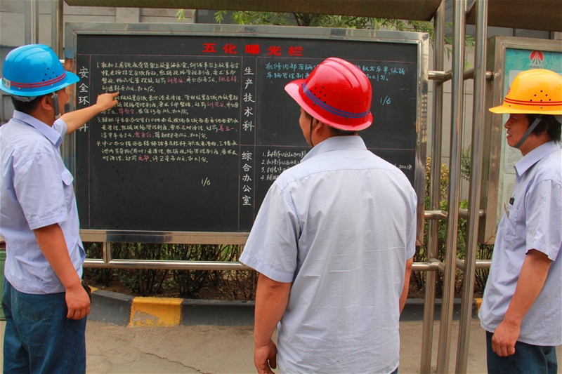 為了更醒目的展現(xiàn)對違章事實、所在單位、所屬專業(yè)和管理人員的處罰,從視覺上提高各級人員對“五化”曝光問題的關(guān)注度,有效杜絕同類問題的重復(fù)出現(xiàn)。近期,設(shè)備管理中心對五化曝光欄進(jìn)行了劃線、標(biāo)識,分區(qū)域、分專業(yè)用粉筆的不同顏色對問題進(jìn)行曝光,突出違章人員姓名和違章考核結(jié)果,充分運用色彩管理將管理者的“面子”、“票子”曝光。