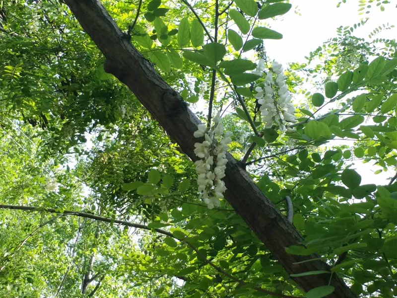 四月正是洋槐花開的季節(jié),白色花絮在綠蔥蔥的枝葉中競相開放,花香四溢,隨處飄散,整個空氣中都跳動著簡單幸福的味道。