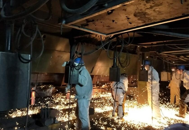 最后一站是攝影記者們向往已久的煉鋼。走進(jìn)煉鋼新區(qū),“打造中國最具競爭力的高端鋼鐵材料服務(wù)商,建成美麗幸福新陜鋼”的巨幅宣傳牌不禁讓人精神一振。當(dāng)走過爐前的“文化長廊”后,加廢鋼的斗子懸在轉(zhuǎn)爐上空,操作室內(nèi),爐長張社寧仔細(xì)地觀察著各個下料成分、重量的數(shù)字變化,看到我們來熱情地打招呼。來到連鑄機(jī)平臺,一名爐前工喊著“讓一下,小心燙”,一邊用厚厚的白手套挑著鋼釬,經(jīng)詢問原來是剛換下來的中包結(jié)晶器套管。中包工們一字排開站立在中包各流口前,操作著中包拉鋼設(shè)備,看著火紅的鋼水聽話地流進(jìn)結(jié)晶器口,前邊是鋼水的炙烤,后邊吹風(fēng)機(jī)呼呼地吹著,鐵打的人也會因?yàn)?小時的長時間站立而困乏顫抖,他們的毅力難以想象。“爐內(nèi)煉鋼,爐外練人”的傳說真是再現(xiàn)了這種情景。