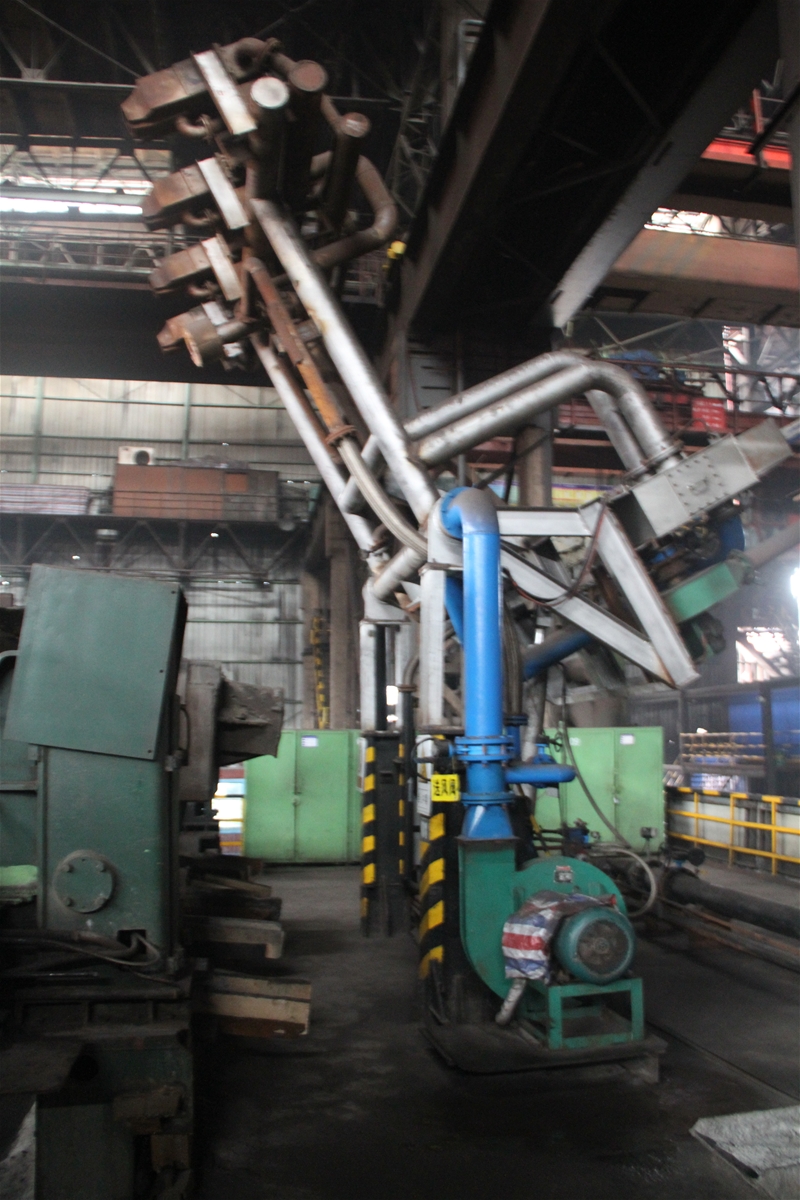 本發(fā)明提出一種新式的灌砂裝置,它可以滿足大包全程加蓋后的灌砂作業(yè),具有操作簡(jiǎn)單、維護(hù)量少、無故障率、定位準(zhǔn)確,通過在鋼包出鋼前運(yùn)行線路上方制作一個(gè)軌道、移動(dòng)小車及旋轉(zhuǎn)軸,小車上焊接一個(gè)專用灌砂斗和¢150mm的鋼管,鋼管垂直對(duì)準(zhǔn)水口,當(dāng)鋼包運(yùn)行到區(qū)域范圍內(nèi),人推小車在軌道上帶動(dòng)灌砂斗調(diào)整縱向灌砂位置,縱向到位后,旋轉(zhuǎn)灌砂斗微調(diào)橫向位置,達(dá)到準(zhǔn)確對(duì)中后,進(jìn)行灌砂作業(yè)。