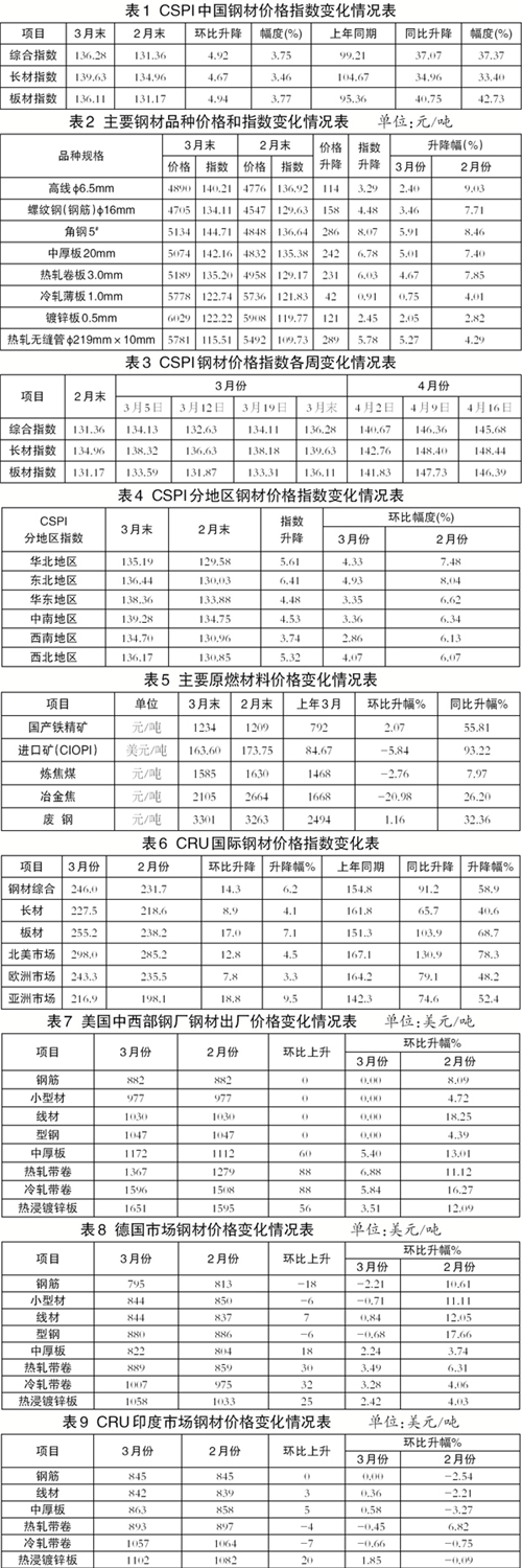 3月末,CSPI長(zhǎng)材指數(shù)為139.63點(diǎn),環(huán)比上升4.67點(diǎn),升幅為3.46%;CSPI板材指數(shù)為136.11點(diǎn),環(huán)比上升4.94點(diǎn),升幅為3.77%,比長(zhǎng)材升幅高0.31個(gè)百分點(diǎn);與去年同期相比,長(zhǎng)材指數(shù)上升34.96點(diǎn),升幅為33.40%;板材指數(shù)上升40.75點(diǎn),升幅為42.73%。(見(jiàn)圖2、表1)