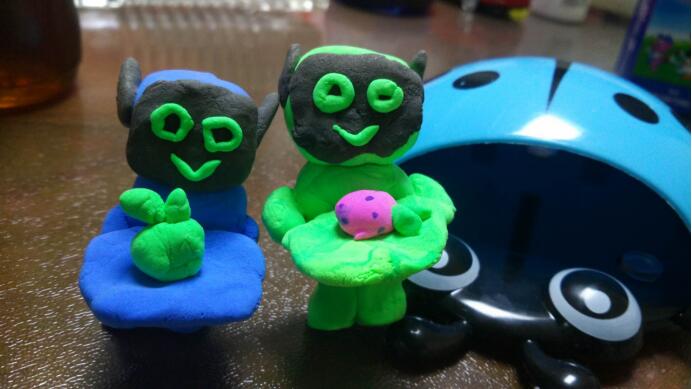 妮子的手很巧,一盒橡皮泥在她的手里像施了魔法似的千變?nèi)f化,想要什么就捏什么:有七彩虹,有美味的心形蛋糕,有漂亮的蝴蝶仙子,有吃著胡蘿卜的兔子,有躺在嬰兒車里的小嬰兒,有套在手指上的大花指環(huán),有掛在脖子上的漂亮吊墜,有小茶壺和小茶杯。旸程喜歡機器人,她就在手機上看了一眼,不一會功夫就捏出來了:藍色的身子,方形的頭,圓圓的眼睛,尖尖的耳朵,手里還托著個盤子,是專門送水或者送別的東西用的,竟和手機上的機器人相差無幾。旸程直夸“真不錯,真像,姐姐真棒!”再一會功夫,妮子又捏出了另一個機器人,倆人學(xué)機器人走路,學(xué)機器人對話,玩得不亦樂乎。