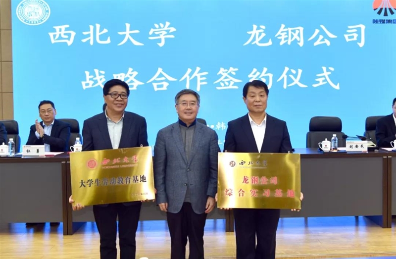 簽約儀式上,雙方簽訂了進一步深化校企戰(zhàn)略合作的框架協(xié)議。郗九生代表龍鋼公司向郭立宏頒發(fā)了聘任證書,聘任郭立宏校長為龍鋼公司管理顧問;郭立宏代表西北大學向龍鋼公司授發(fā)了“西北大學綜合實習基地”“西北大學大學生勞動教育基地”牌。