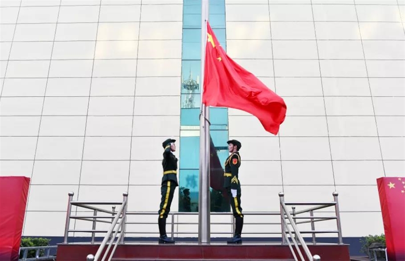 7:30分,英姿颯爽的國旗護(hù)衛(wèi)隊(duì)隊(duì)員邁著矯健的步伐,護(hù)衛(wèi)著五星紅旗走向升旗臺(tái),在莊嚴(yán)雄壯的國歌聲中,鮮艷的五星紅旗在金色晨光的沐浴下,在眾人的注目下,冉冉升起,全場人員心情澎湃、豪情滿懷。共同祝愿偉大祖國繁榮昌盛、國泰民安,祝愿企業(yè)基業(yè)長青、蓬勃發(fā)展。