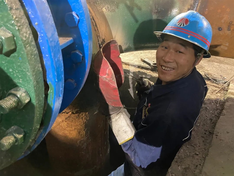 在高線循環(huán)泵房內(nèi),只見進(jìn)水主管道一角弧光閃耀、焊花飛濺,卻不見人影,走近一看,原來焊工梁曉鋒正蜷縮在管道的縫隙中進(jìn)行管道焊接作業(yè)?此坪唵蔚暮附幼鳂I(yè),實則不易,由于空間狹小,身高一米八的他在縱橫交錯的管道中不斷變換著姿勢,時而仰面、時而下蹲、時而平躺,起弧、運條、點焊、收尾……焊把在他的手中飛舞,美麗的弧光映紅了他的臉龐。面對一道道完美的焊縫,他臉上露出了滿意的笑容。他抖了抖麻木的腿腳,直了直酸痛的腰背,然后又投入到另一項縫隙焊接工作中……