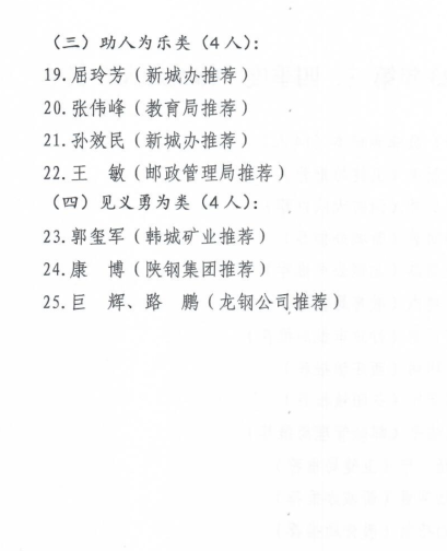 近日,韓城市2023年第三、四季度“韓城好人”和年度道德模范名單出爐。公司6名職工“榜上有名”。其中范磊磊、楊偉峰榮獲敬業(yè)奉獻類“韓城好人”,巨輝、路鵬榮獲見義勇為類“韓城好人”,周海霞榮獲助人為樂類“道德模范”,王亞軍榮獲自強勵志類“道德模范”。